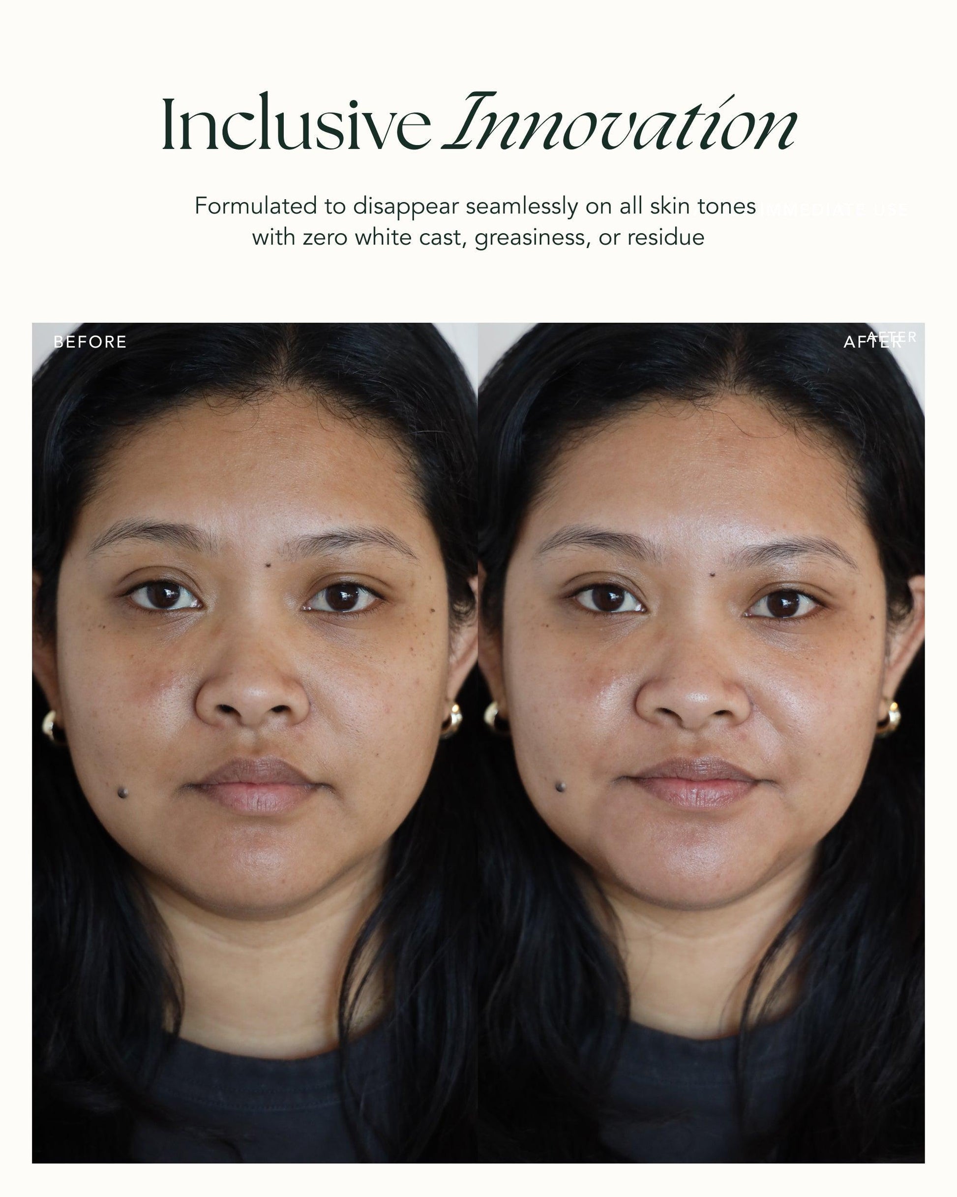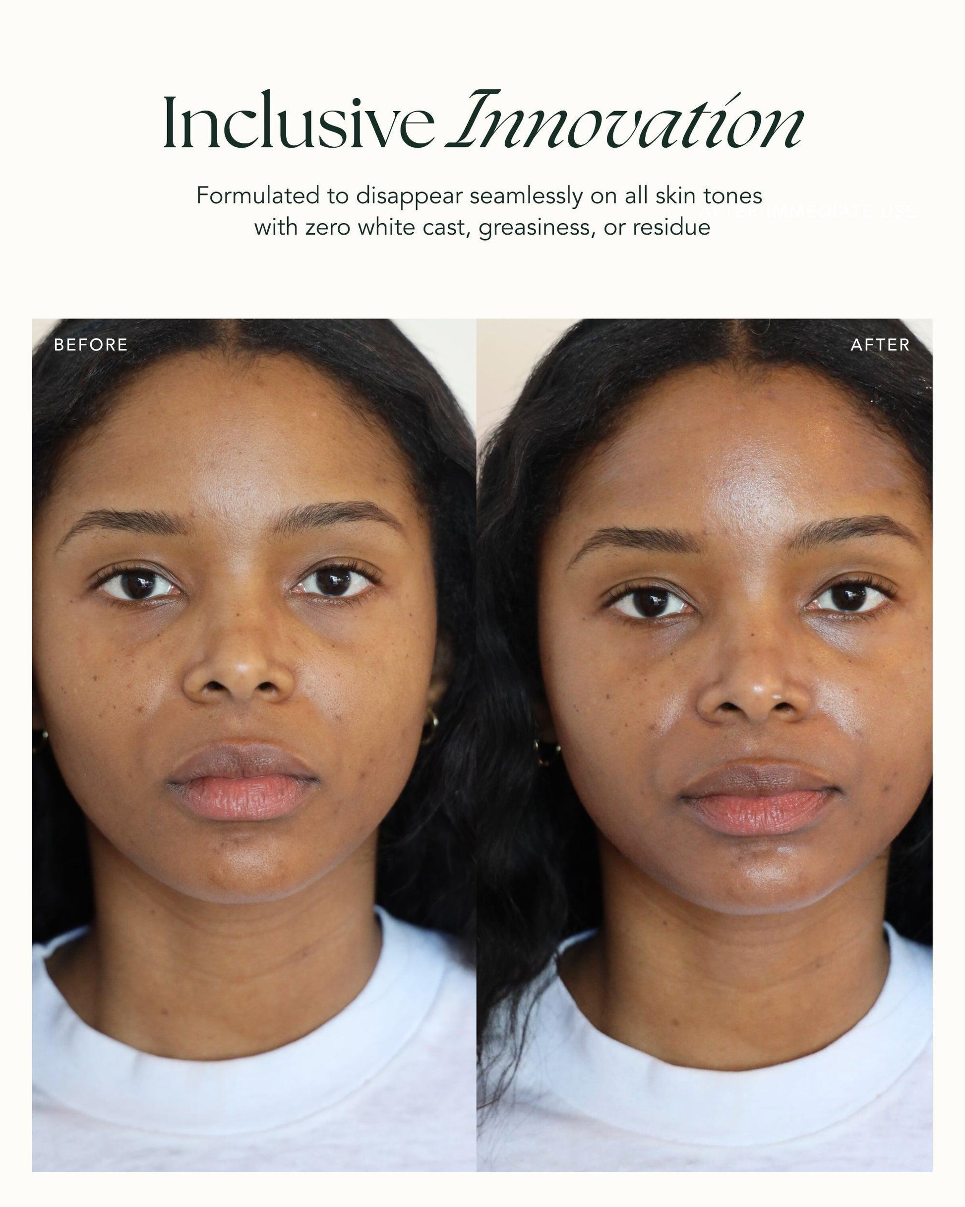 Brightening Mineral Sunscreen SPF 50+ is a daily defense against sun damage, blue light, and free radicals. This lightweight, 100% mineral sunscreen harnesses the power of 20 antioxidant-rich adaptogens and zinc oxide to create an Adaptogenic Shield Complex™. Imagine a fortress around your skin, blocking harmful rays while nourishing and strengthening from within. Hydrating squalane fortifies your moisture barrier, ensuring your complexion stays plump and dewy.