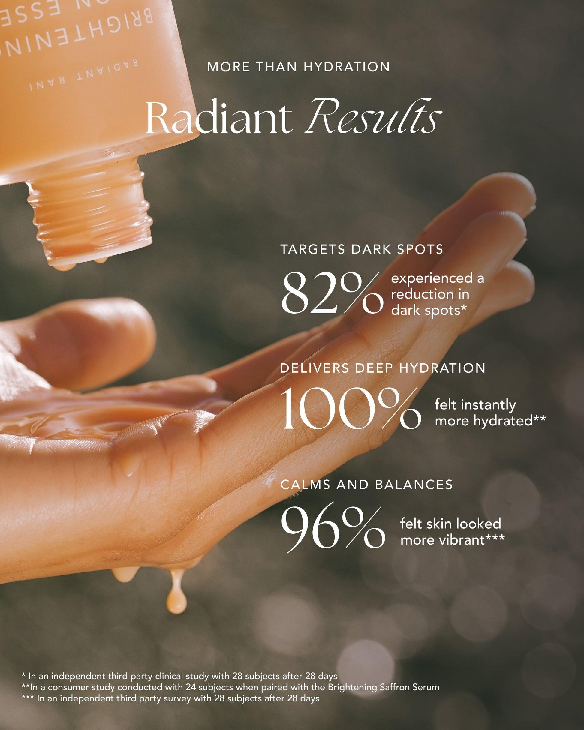 Follow with the award-winning Brightening Saffron Serum, your brightening powerhouse. Packed with potent saffron and vitamin C, it tackles uneven tone, dark spots, and dullness head-on. The result? A luminous, even, and utterly radiant glow that'll have you basking in compliments.