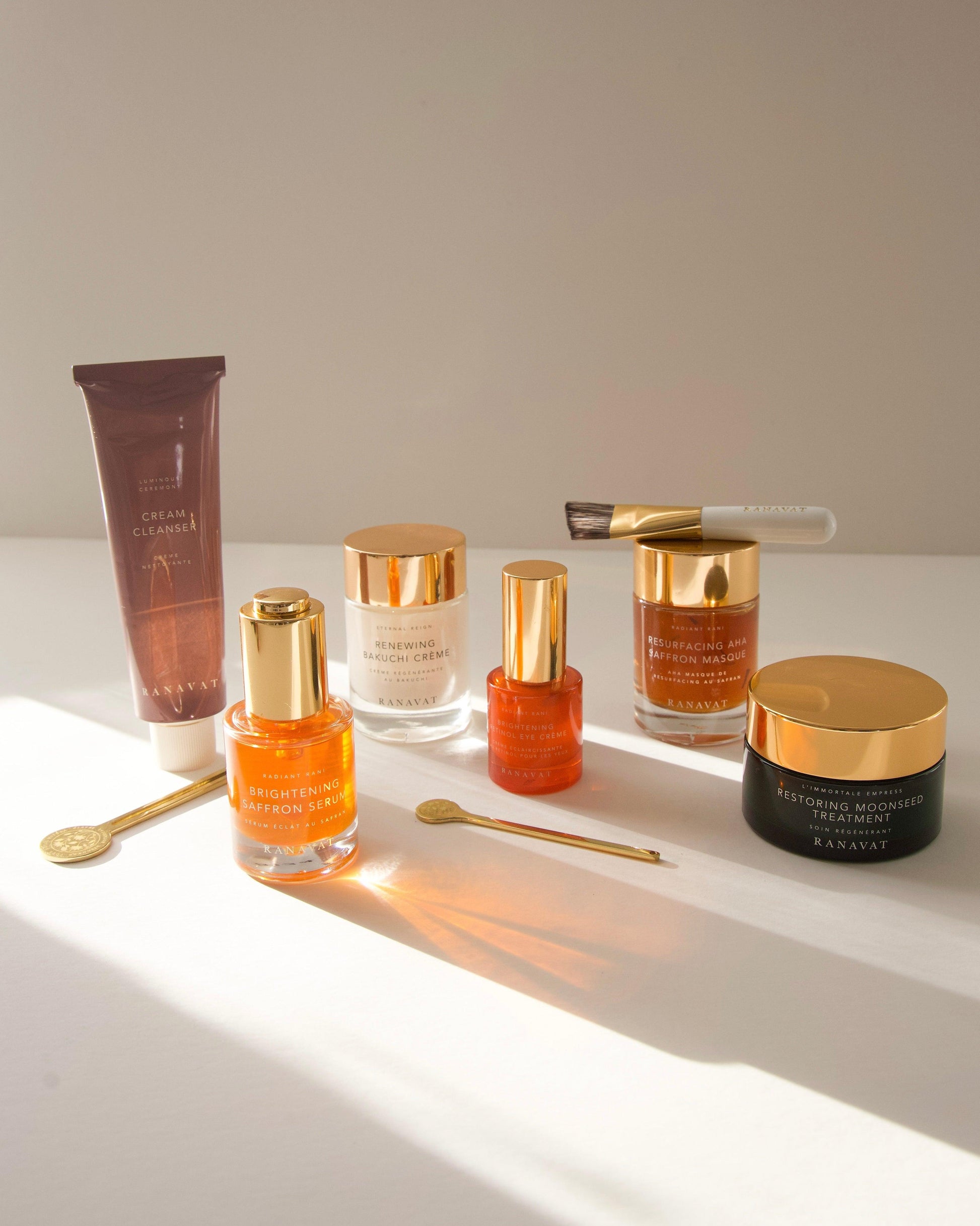 Ranavat Imperial Radiance Ritual truly immerses you in the opulence of Ayurvedic rituals. The exquisite blue-hued box unveils an indulgent array – six RANAVAT bestsellers, accompanied by three luxurious accessories. A lavish feast for the senses, it houses the Ritual Brush, Key, and Wand alongside the potent Resurfacing AHA Saffron Masque, Brightening Retinol Eye Crème, Cream Cleanser, Brightening Saffron Serum, Renewing Bakuchi Creme, and Restoring Moonseed Treatment.
