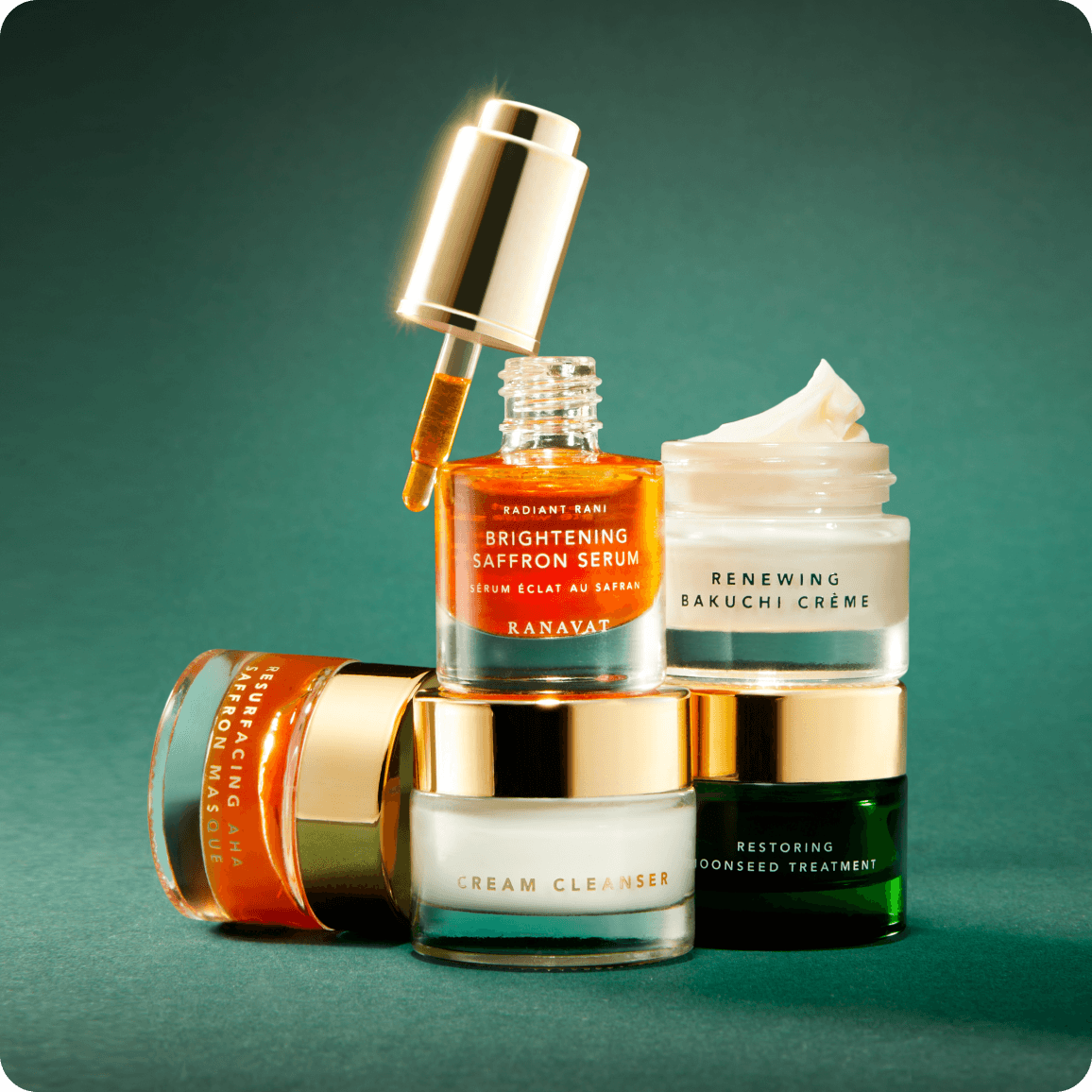 The Cream Cleanser gently melts away impurities, prepping your canvas for the Resurfacing AHA Saffron Masque – a potent exfoliant that unveils a luminous glow. Follow with the Brightening Saffron Serum, a Vogue-approved elixir that floods skin with antioxidants for a radiant, even-toned complexion.