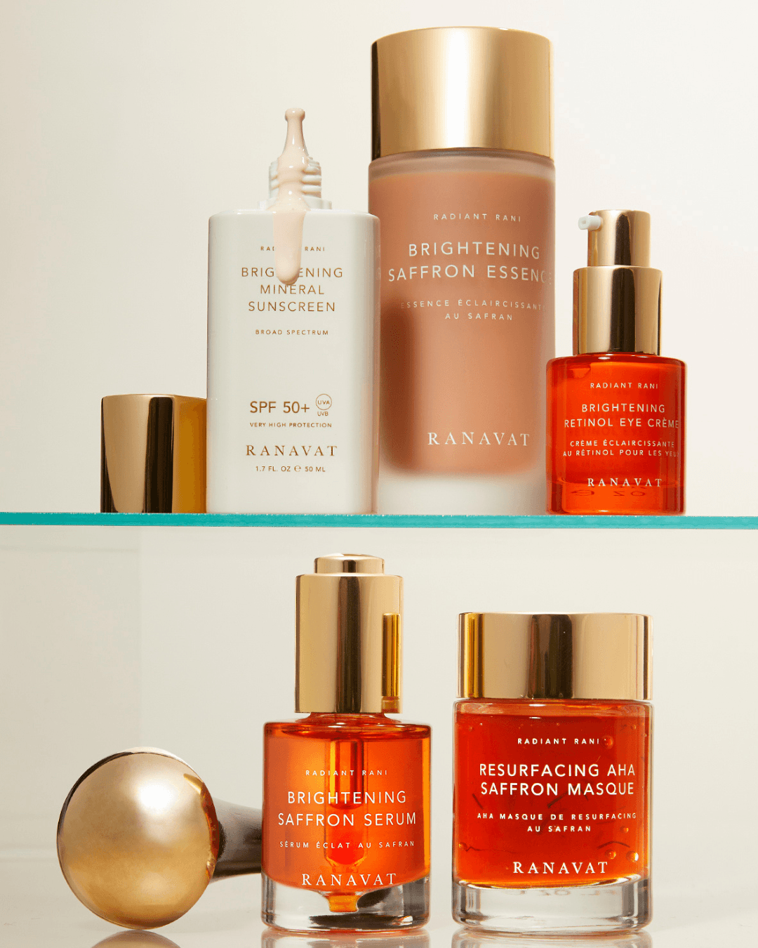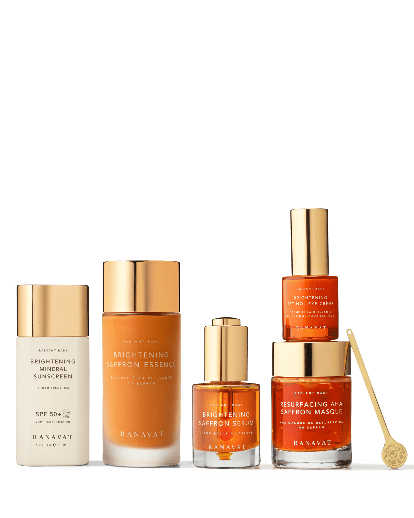 But that's not all – this regal assembly includes a brightening mineral sunscreen, a saffron essence that envelops your skin in hydration, a resurfacing masque that gently polishes away dullness, and a retinol eye creme that bestows a youthful radiance upon your delicate eye area.